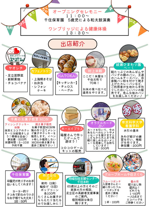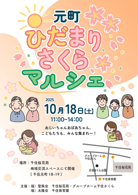 お知らせ · 2025/10/07 10月18日(土)元町ひだまり さくら マルシェが開催されます。 10月18日(土)11:00~14:00 元町ひだまりさくらマルシェが開催! おじいちゃん おばあちゃん、こどもたちも、みんな集まれ! 千住桜花苑 地域交流スペースを会場に、地元商店の新鮮野菜、お米、お惣菜などの販売、ゲームコーナ(射的、輪投げ、ヨーヨー釣り)、水引の基本を学ぶなど、詳しくはチラシをご覧ください。 千住元町周辺にお住まいの皆さま、お誘いあわせのうえお越しください♪ tagPlaceholderカテゴリ: