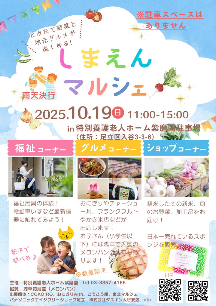 お知らせ · 2025/09/08 10/19 しまえんマルシェ開催! 10月19日(日)しまえんマルシェが開催されます 社会福祉法人連絡会の会員である、社会福祉法人 愛寿会の紫磨園さんで、10/19にマルシェが開催されます。 新米や新鮮野菜の販売、グルメコーナーのほか、電動車いすなど福祉用具の体験コーナーもあります。詳しくはチラシをご覧ください。 入谷3丁目周辺にお住まいの皆さま、お誘いあわせのうえお越しください♪ 紫磨園 ホームページ tagPlaceholderカテゴリ: